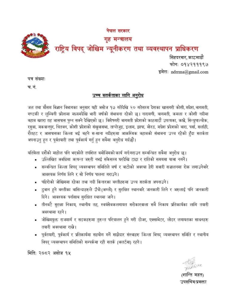 बुधबार बेलुका विभागको मौसम पूर्वानुमान शाखाले विज्ञप्ति जारी गर्दै विभागले बागमती प्रदेशका काठमाडौँ उपत्यका (ललितपुर, भक्तपुर, काठमाडौं), काभ्रे, सिन्धुपाल्चोक, रसुवा, मकवानपुर, चितवन, कोशी प्रदेशका संखुवासभा, ताप्लेजुङ, इलाम, झापा, मोरङ जिल्ला, मधेश प्रदेशका बारा, पर्सा, सर्लाही, रौतहट र आसपासका जिल्ला भई बहने स-साना नदीहरुमा आकस्मिक बहावको सम्भावना उच्च रहेको हुँदा विशेष सतर्कता अपनाउन अनुरोध गरेको हो ।