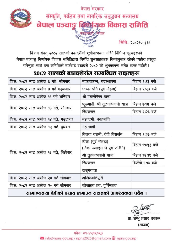 विजयादशमी आफैँमा शुभ दिन भएकाले आज टीका लगाउन सामान्य मानिसले साइत खोज्नु नपर्ने समितिका अध्यक्ष प्रा शम्भु प्रसाद ढकालले जानकारी दिए।
