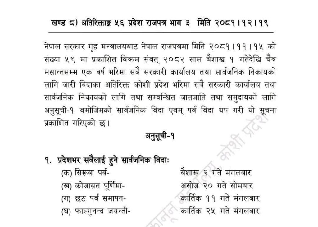 यस अनुसार, कोशी प्रदेशभर सबैलाई लागू हुने सार्वजनिक बिदाहरूमा बैशाख २ गते मंगलबार पर्ने सिरुवा पर्व, असोज २० गते सोमबार पर्ने कोजाग्रत पूर्णिमा, कार्तिक ११ गते मंगलबार पर्ने छठ पर्व सम्पन्न, र कार्तिक २५ गते मंगलबार पर्ने फाल्गुनन्द जयन्ती रहेका छन्।