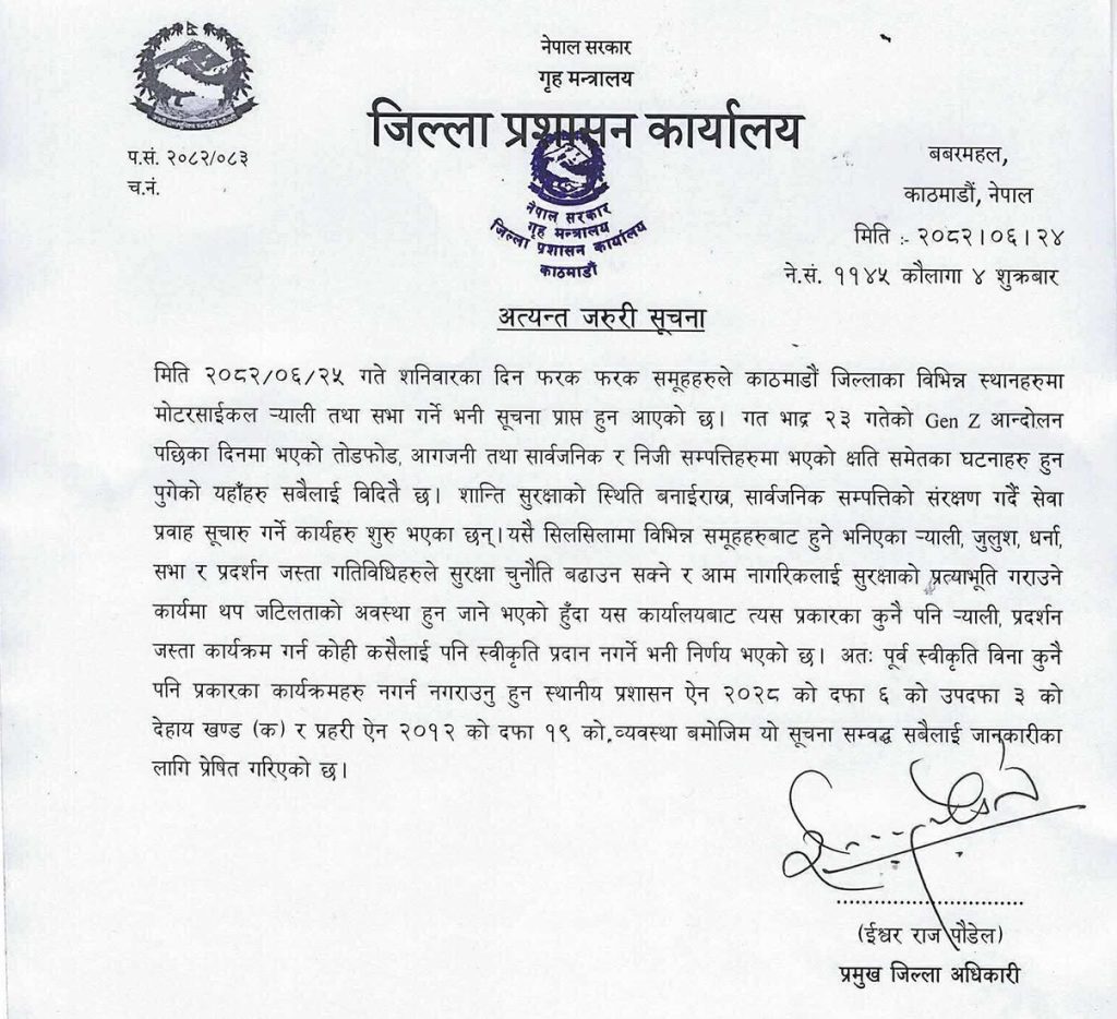 प्रशासनले यसबारे जानकारी दिन शुक्रबार सार्वजनिक सूचना जारी गरेको छ । यस कार्यालयबाट यस्ता कुनै पनि र्‍याली, प्रदर्शन वा सभा गर्न स्वीकृति नदिने निर्णय गरिएको छ सूचनामा भनिएको छ, यससँगै युवा संघको र्‍याली कार्यक्रम अनिश्चित बनेको छ।