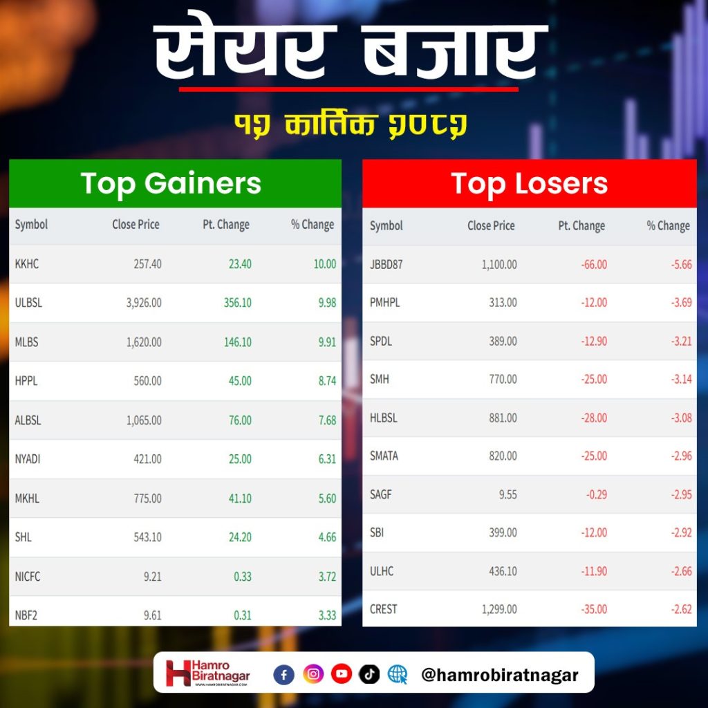 ८५ कम्पनीको मूल्य बढ्दा १५९ को घट्यो भने ६ को स्थिर रह्यो । होटल तथा पर्यटन समूह २.१५, व्यापार २.०० तथा हाइड्रोपावर ०.०१ प्रतिशत बढे ।