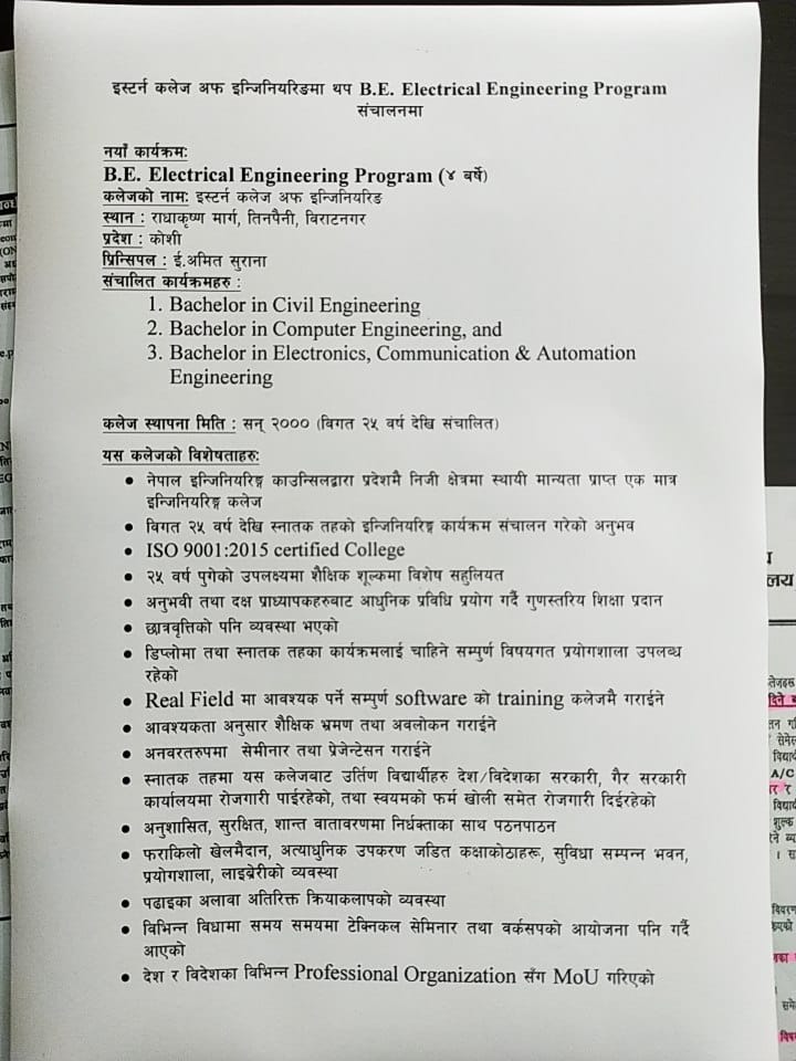 विराटनगर । ईस्टर्न कलेज अफ इन्जिनियरिङले नयाँ शैक्षिक कार्यक्रम बिई इलेक्ट्रिकल इन्जिनियरिङ (४ वर्षे) सहित सबै कार्यक्रममा भर्नाका निम्ति पुन: प्रवेश परीक्षाका लागि आवेदन खुलेको छ ।
