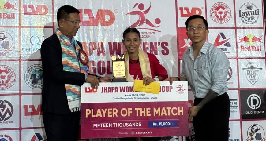 खेलको प्लेयर अफ द म्याच पुलिसकी मिना देउबा भइन् । उनले नगद १५ हजार र ट्रफी पाइन् । उनलाई प्रमुख अतिथि शिवसताक्षी नगरप्रमुख मेगाहाङ थोप्रा, आयोजक झापा महिला गोल्डकपका अध्यक्ष सन्तोष थोप्रा र ग्यारेज क्याफेका सञ्चालक लुका राईले ट्रफी प्रदान गरेका थिए ।