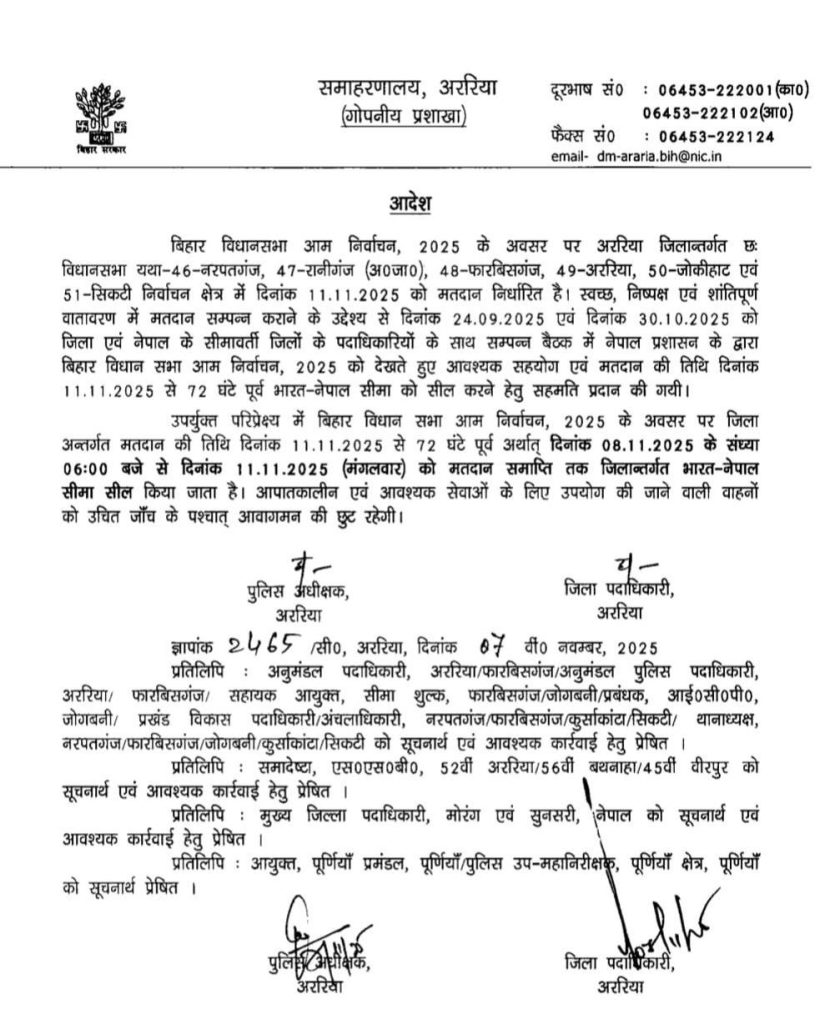 अररिया जिल्लाका जिल्ला अधिकारी र प्रहरी अधीक्षकले संयुक्त रूपमा जारी गरेको आदेशअनुसार मतदानको ७२ घण्टा अघि अर्थात् २०२५ नोभेम्बर ८ शनिबारबाट सीमा सिल गरिने जनाइएको छ।
