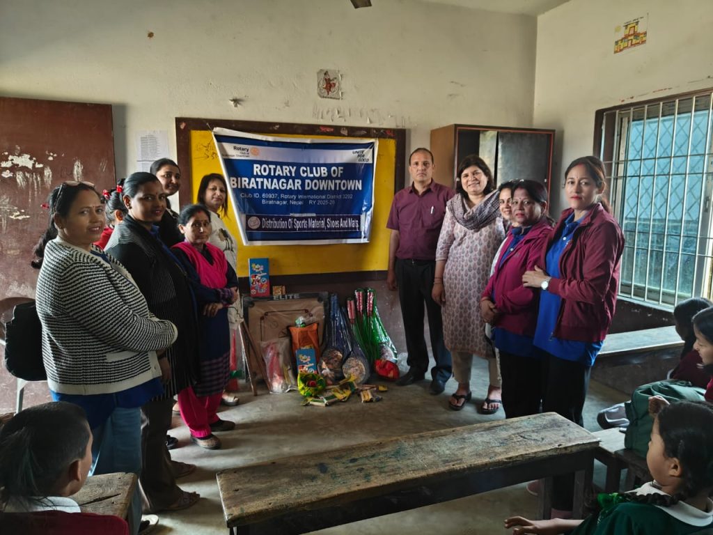 बिराटनगर । रोटरी क्लब अफ बिराटनगर डाउनटाउनले विद्यालयमा खेल–शिक्षा र शारीरिक विकासलाई प्रोत्साहन गर्ने उद्देश्यले आज थप दुई सामुदायिक विद्यालयमा खेलकुद सामग्री वितरण गरेको छ।