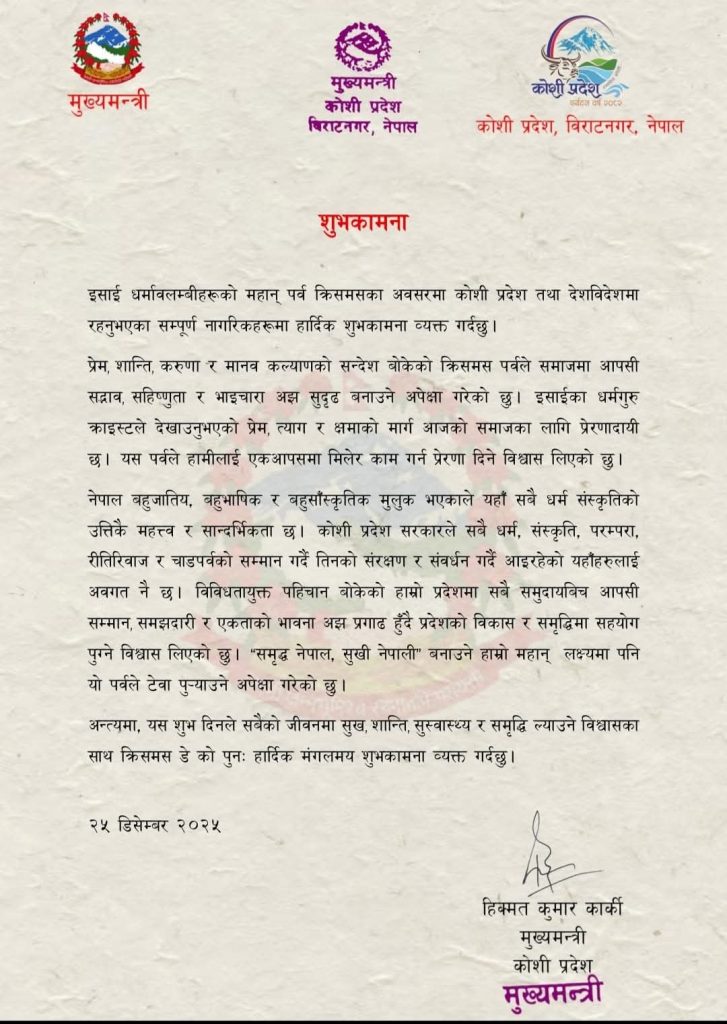 विराटनगर । कोशी प्रदेशका मुख्यमन्त्री हिक्मत कुमार कार्कीले इसाई धर्मावलम्बीहरूको पर्व क्रिसमसको अवसरमा स्वदेश तथा विदेशमा रहेका नेपाली नागरिकलाई शुभकामना दिएका छन् ।