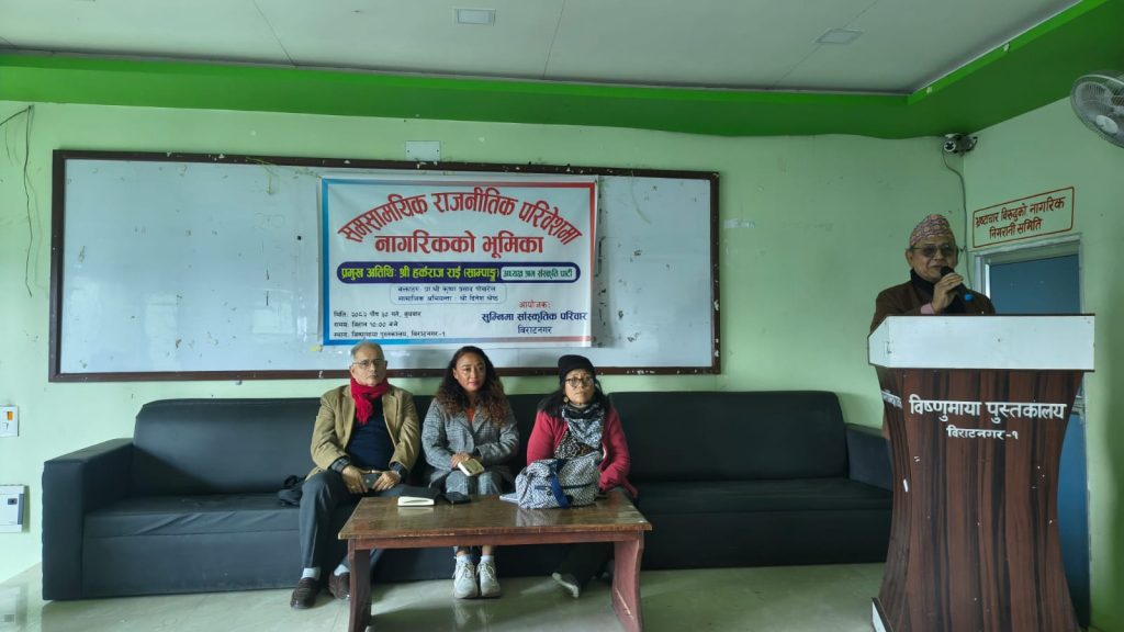 विराटनगर । सुम्निमा सांस्कृतिक परिवार विराटनगरले आयोजना गरेको समसामयिक राजनीतिक परिवेशमा नागरिकको भूमिका विषयक अन्तरसंवाद कार्यक्रममा धरानका मेयर हर्क साम्पाङ सहभागी हुने प्रचार गरिएको थियो । तर, १० बजेका लागि तय गरिएको कार्यक्रमका सहभागीले साम्पाङलाई साढे १२ बजेसम्म पर्खिएर ।