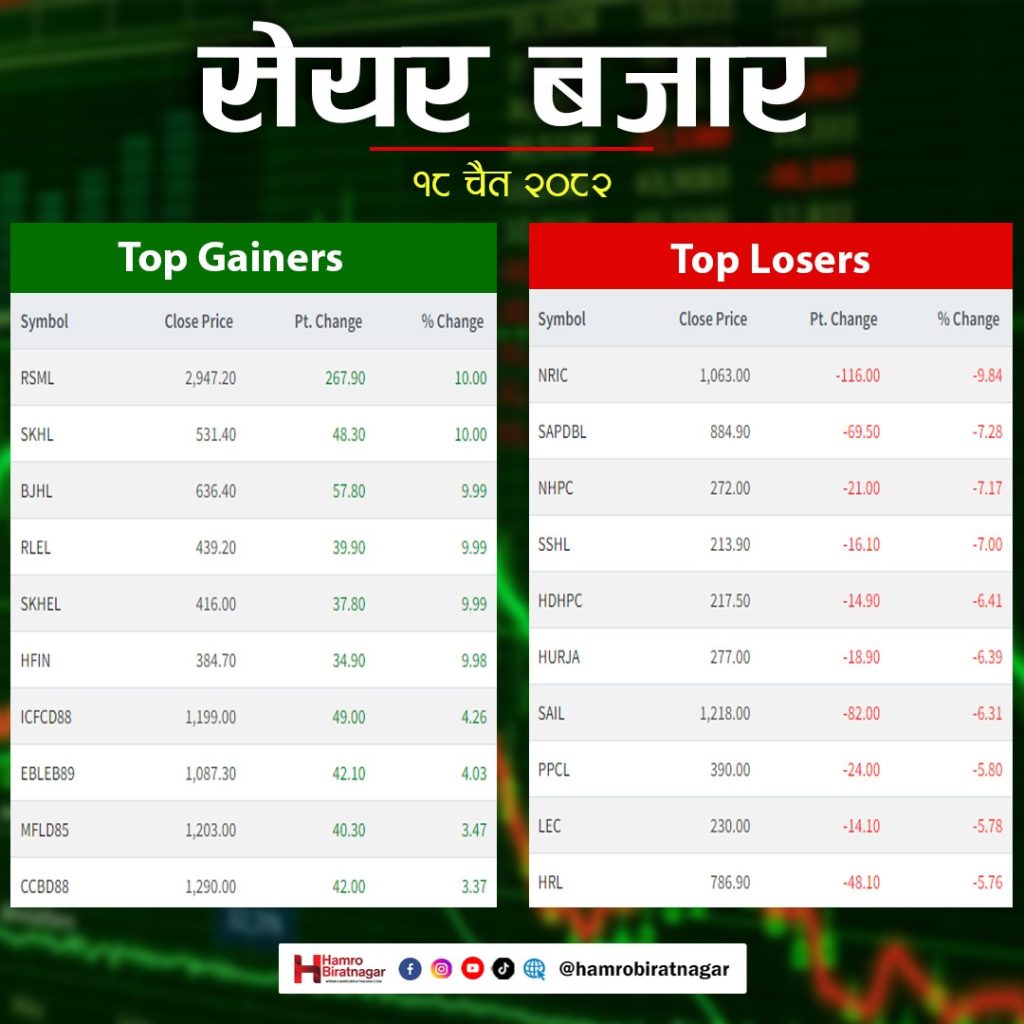 नेपाल पुनर्बीमाको मूल्य सबैभन्दा धेरै ९.८४ प्रतिशत घट्यो । त्यस्तै सप्तकोशी विकास बैंकको ७.२८, नेसनल हाइड्रोपावरको ७.१७, शिवश्री हाइड्रोपावरको ७.००, हिमाल दोलखा हाइड्रोपावरको ६.४१ प्रतिशत मूल्य घट्यो ।