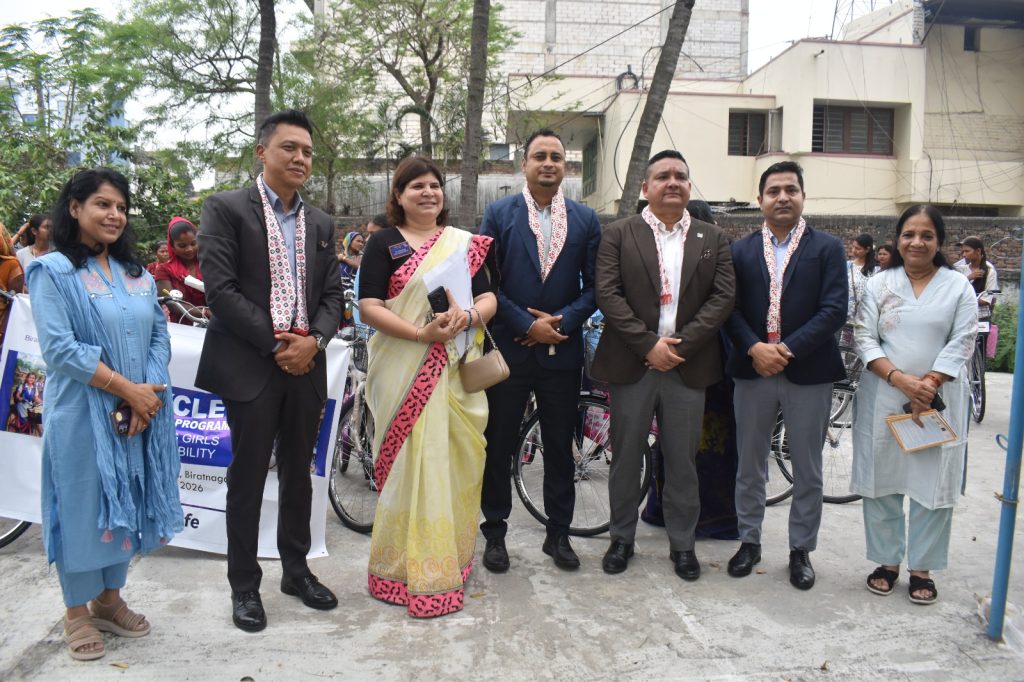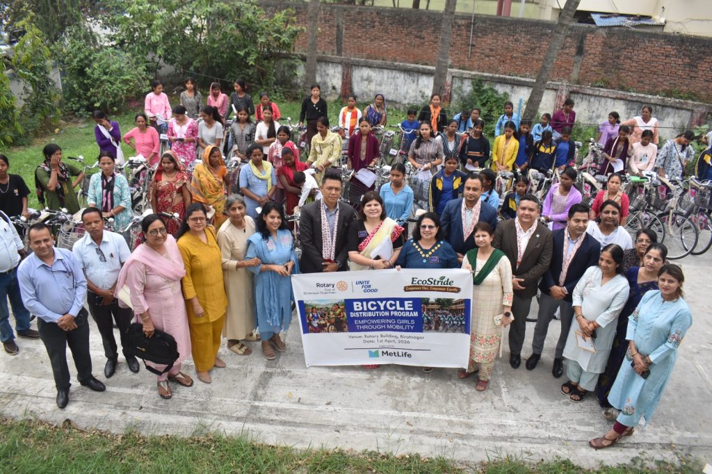 विराटनगर । रोटरी क्लब अफ विराटनगर डाउनटाउनले “EcoStride – Empower Her, Empower Earth” नामक परियोजना अन्तर्गत मोरङ जिल्लाका महिला विद्यार्थी तथा परिवारको आर्थिक जिम्मेवारी सम्हालिरहेका महिलाहरूलाई ५६ वटा साइकल वितरण गरेको छ। परियोजनालाई मेट लाइफ इन्स्योरेन्सले आर्थिक सहयोग प्रदान गरेको हो।