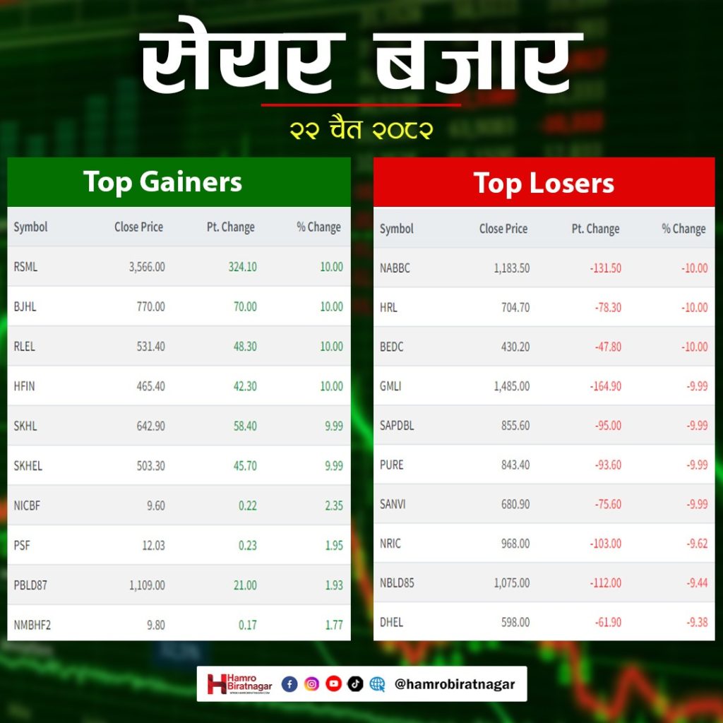 घटेको बजारमा चार कम्पनीका लगानीकर्ताले सर्वाधिक कमाएका छन् । जसमा रिलायन्स स्पिनिङ मिल्स लिमिटेड, भुजुङ हाइड्रोपावर लिमिटेड, रिजलाइन इनर्जी लिमिटेड र होटल फरेस्ट इन लिमिटेड रहेका छन् । यी कम्पनीको शेयरमूल्यमा सकारात्मक सर्किट लागेको छ ।