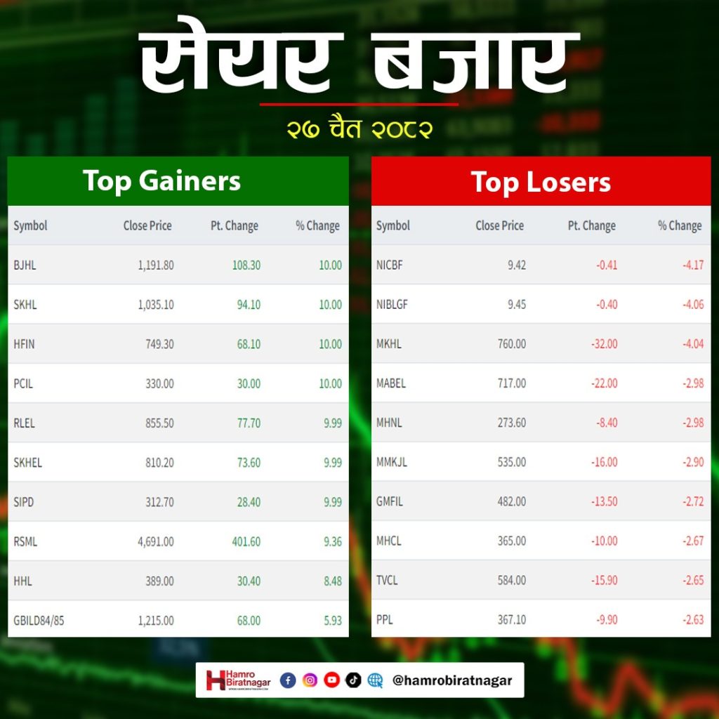 आज हाइड्रो समूह र उत्पादन तथा प्रशोधन समूह बाहेक सबै समूहमा रातो पोतिएको छ । हाइड्रो समूह ०.०८ प्रतिशत बढेको भने उत्पादन तथा प्रशोधन समूह १.५९ प्रतिशत बढेको छ ।
