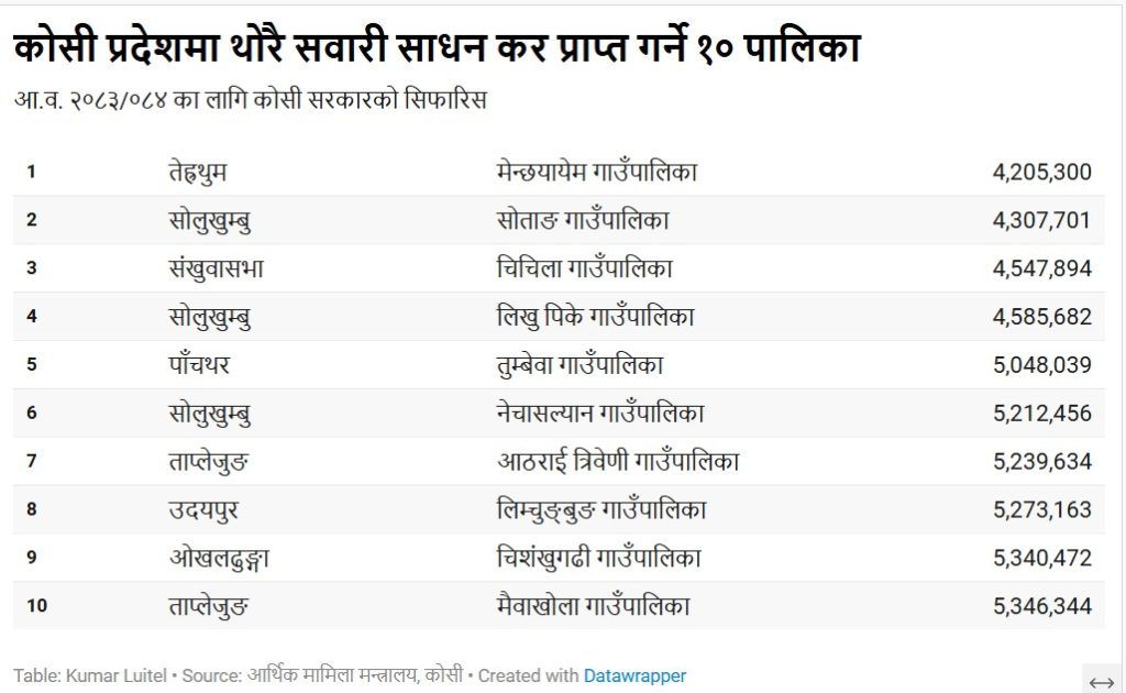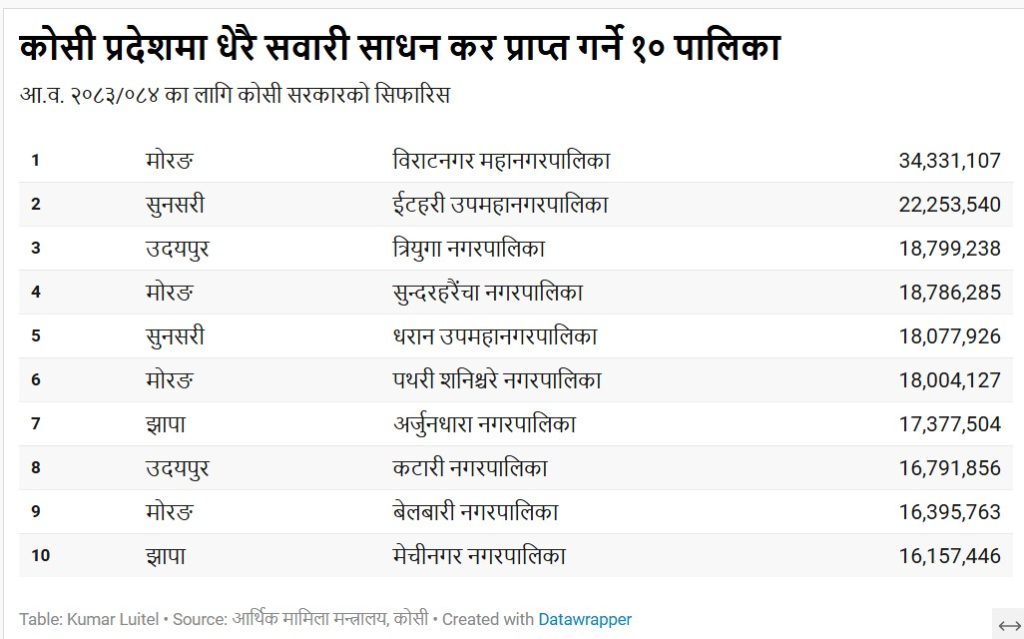 अन्तरसरकारी वित्त व्यवस्थापन ऐन, २०७४ को दफा ६ ‘क’ र कोसी प्रदेश प्रदेश वित्त व्यवस्थापन ऐन, २०७५ को दफा ३ को व्यवस्थाबमोजिम राष्ट्रिय प्राकृतिक स्रोत तथा वित्त आयोगको सिफारिसअनुसार स्थानीय तहका निम्ति आउँदो आर्थिक वर्ष प्राप्त हुने सवारी कर बाँडफाँटको हिस्साको अनुमानित सीमा पठाइएको मन्त्रालयले जनाएको छ ।
