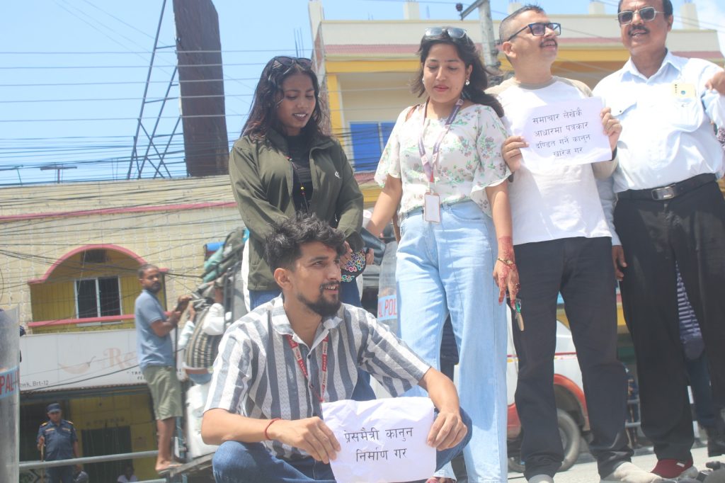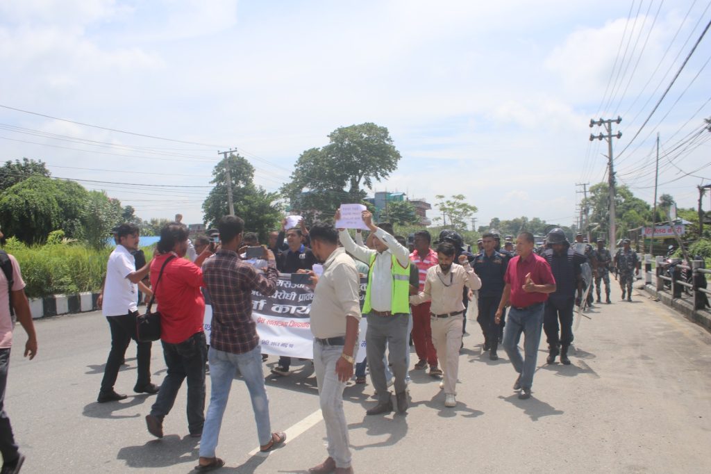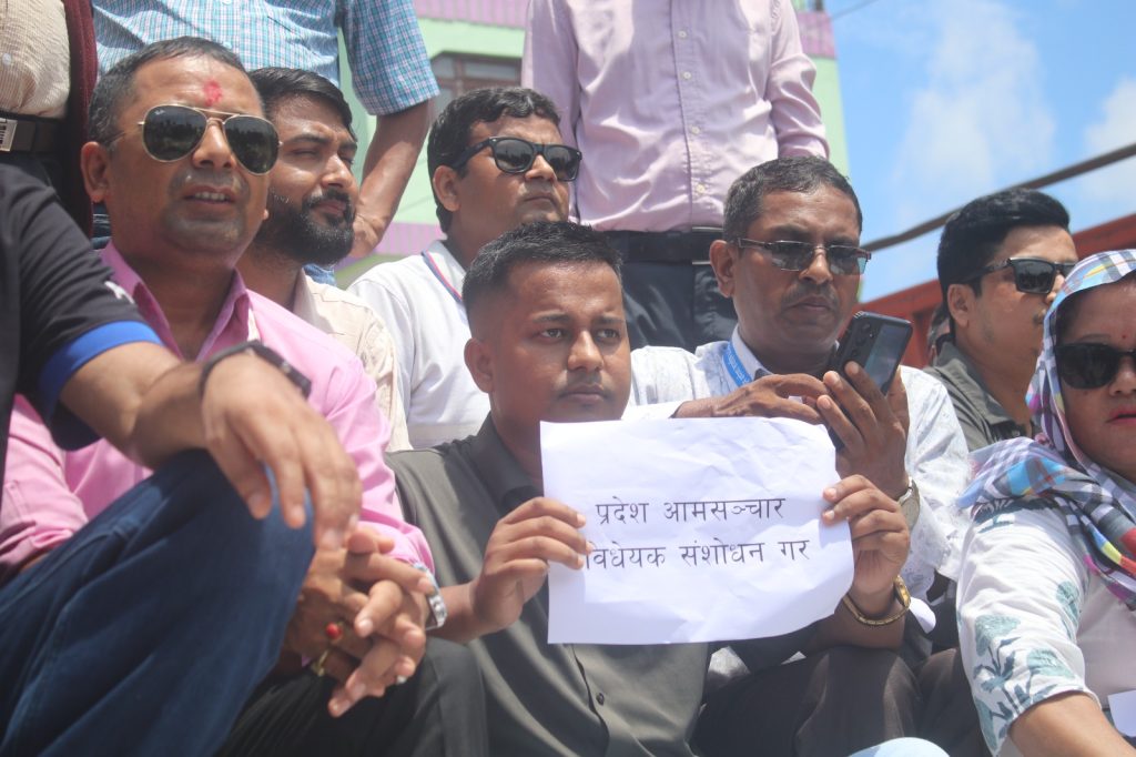विराटनगर। कोसी प्रदेश सरकारले अघि सारेको संचार विधेयकको विरोधमा पत्रकारहरूले बिहीबार मुख्यमन्त्री कार्यालय अगाडि विरोध प्रदर्शन गरेका छन्। प्रदर्शनपछि जुलुस रोडशेष चोक पुगेर धर्नामा परिणत भएको थियो।
